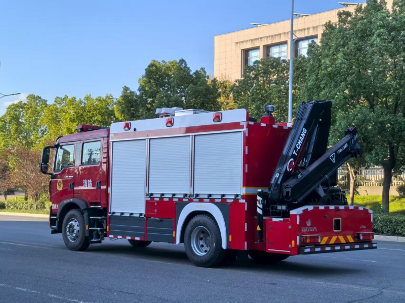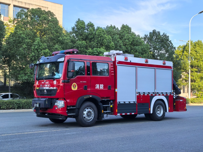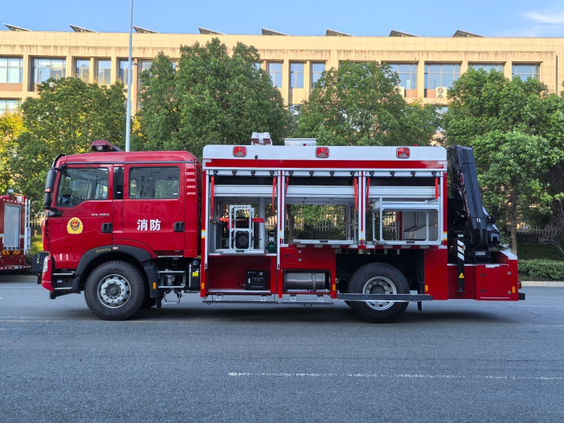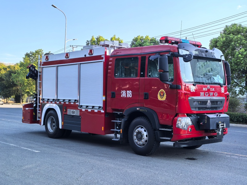 重汽豪沃带吊消防抢险救援车是一款集多种功能于一体的特种消防车,主要用于应对各种自然灾害、突发事件及抢险救援等任务。以下是其详细介绍: