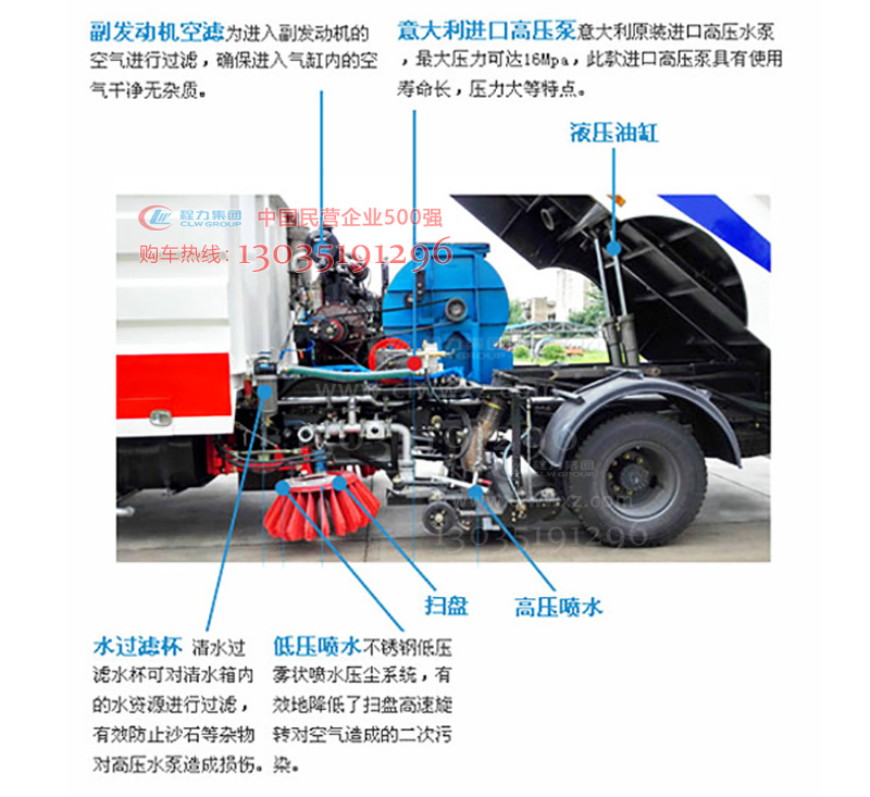 1、带2个中置扫盘;中置超宽吸嘴;双层吸尘筒;170马力副发动机;液压阀;大力马达;高压水泵(前冲/侧喷/中喷/后喷雾)/侧冲洗水枪/垃圾箱自洁装置);万向高压路沿清洗;低压泵(前冲),气动球阀控制;4mm不锈钢垃圾箱;不锈钢水箱;控制器;尾部箭头灯;机油、垃圾箱、水箱均带防溢或低位报警装置;倒车及洗扫状态室内监视器;多种语音提示;倒车自动保护、防倾倒垃圾翻车保护、检修安全保护;20m高压冲洗卷盘;刷臂转动机构使用德国进口高新耐磨工程隔套,免打黄油;精密冷弯无缝液压油管;运动控制器一键电脑控制。